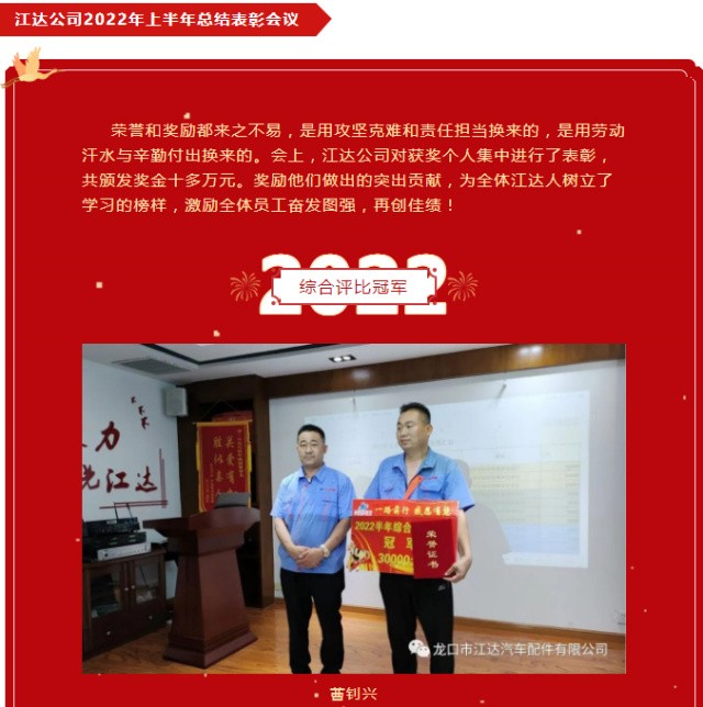 董事長在總結(jié)中指出:2022年上半年,是十幾年以來不平凡的半年,訂單增加,原材料漲價,在管理人員幾乎沒有增加的情況下,我們的產(chǎn)量翻倍增加,同時各個管理崗位工作量翻倍增加,在所有管理者的帶動下,廣大員工齊心協(xié)力,奮勇拼搏,在超負荷的工作中,無怨無悔,勇于奉獻,創(chuàng)造出一曲江達公司只爭朝夕、奮勇爭先的壯美凱歌。