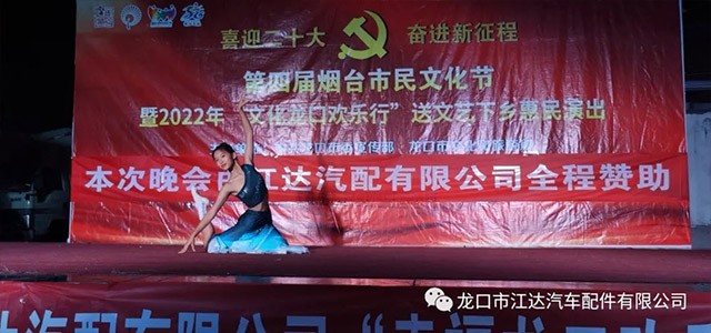 2022年9月6日晚,蘭高鎮(zhèn)柳家村文化廣場(chǎng)熱鬧非凡,以“喜迎二十大 奮進(jìn)新征程”為主題的第四屆煙臺(tái)文化節(jié)暨2022年“文化龍口歡樂行”送文藝下鄉(xiāng)惠民演出活動(dòng)在蘭高鎮(zhèn)柳家村隆重舉行,本次活動(dòng)由龍口市委宣傳部、龍口市文化旅游局主辦,龍口市江達(dá)汽車配件有限公司全程贊助。