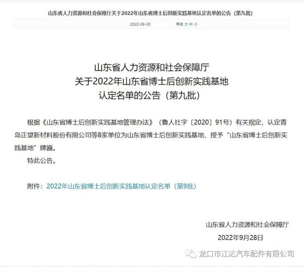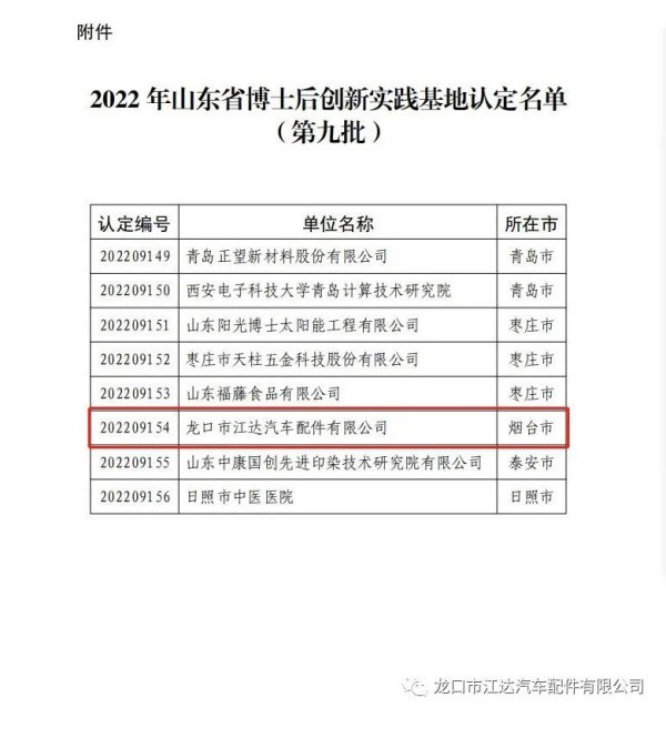 十.一前夕,由山東省人力資源和社會保障廳傳來喜訊,龍口市江達汽車配件有限公司從眾多遴選企業(yè)中脫穎而出,成功被認定為“山東省博士后創(chuàng)新實踐基地”。